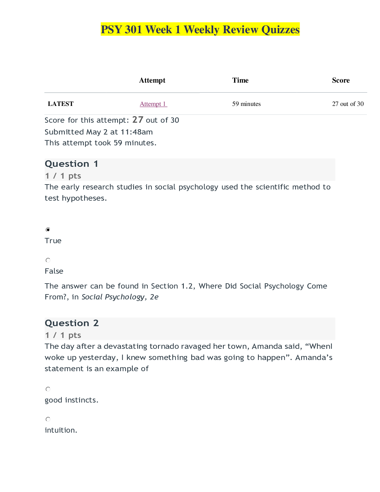 *NURSING > EXAM > PSY 301 Week 1 Weekly Review Quizzes-Ashford University (All)