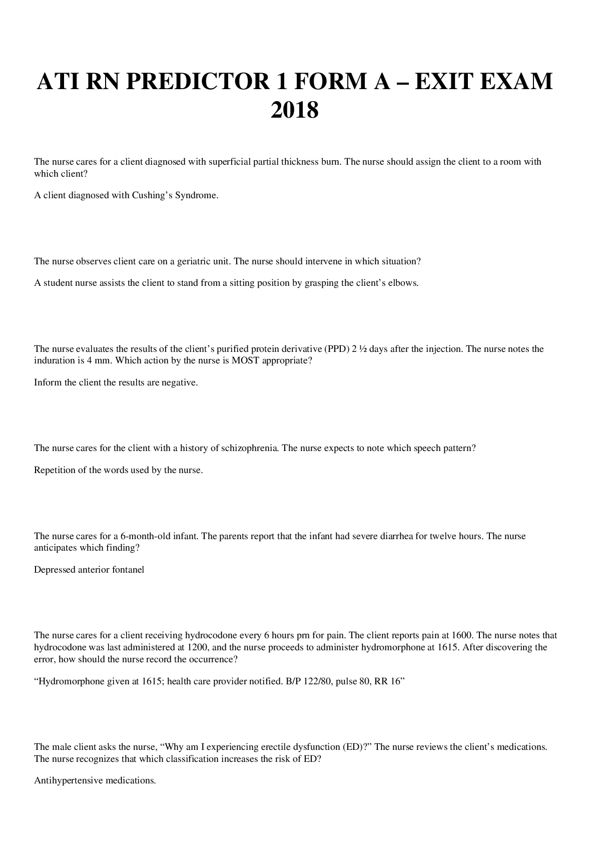 *NURSING > QUESTIONS & ANSWERS > ATI RN PREDICTOR 1 2018 FORM A – EXIT EXAM QUESTIONS and ANSWERS | (All)