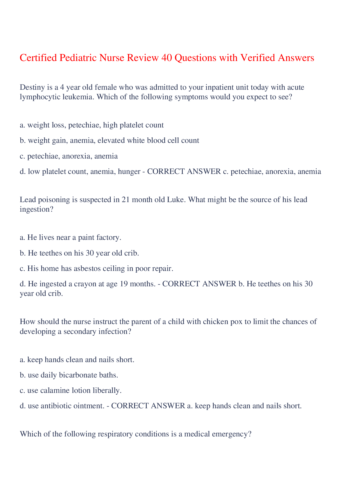 *NURSING > EXAM > Certified Pediatric Nurse Review 40 Questions with Verified Answers,100% CORRECT (All)