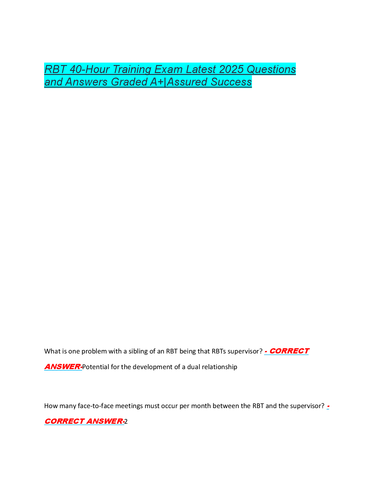 *NURSING > EXAM > RBT 40-Hour Training Exam Latest 2025 Questions and Answers Graded A+|Assured Success (All)