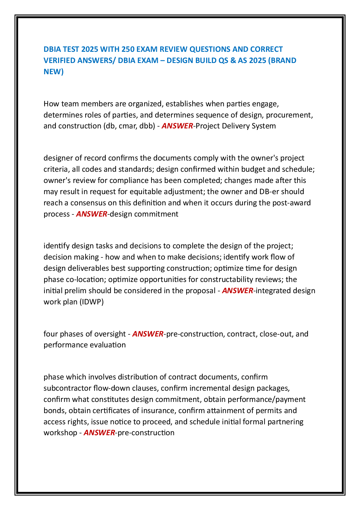 *NURSING > EXAM > DBIA TEST 2025 WITH 250 EXAM REVIEW QUESTIONS AND CORRECT VERIFIED ANSWERS/ DBIA EXAM – DESIGN BUILD QS & AS 2025 (BRAND NEW)