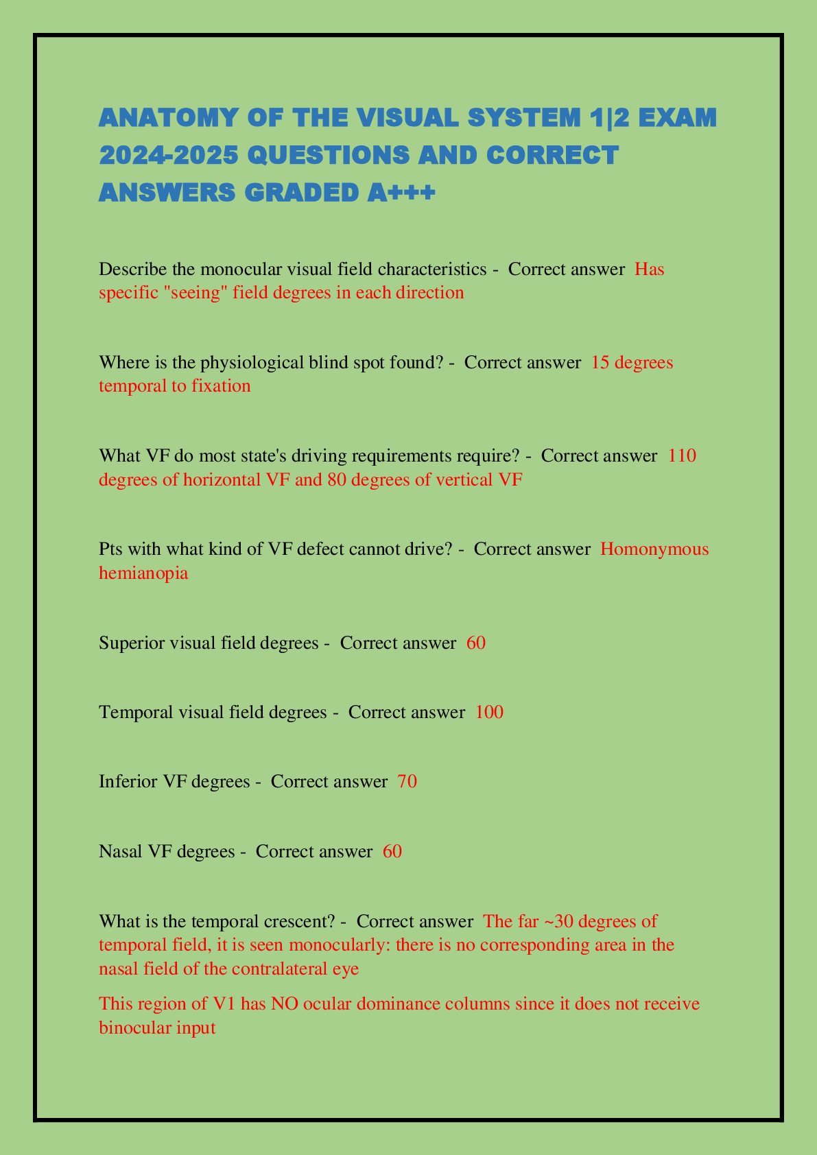 *NURSING > EXAM > ANATOMY OF THE VISUAL SYSTEM 1|2 EXAM 2024-2025 QUESTIONS AND CORRECT ANSWERS GRADED A+++