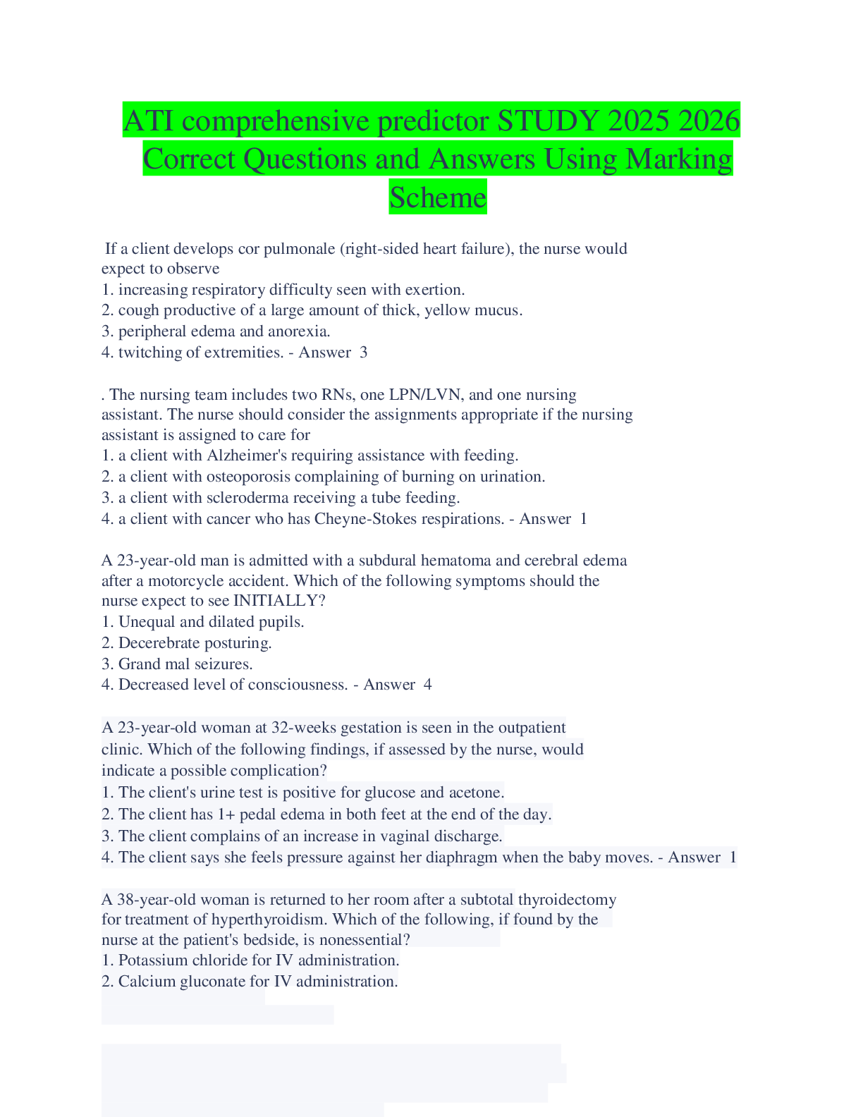 *NURSING > EXAM > ATI comprehensive predictor STUDY 2025 2026 Correct Questions and Answers Using Marking Scheme