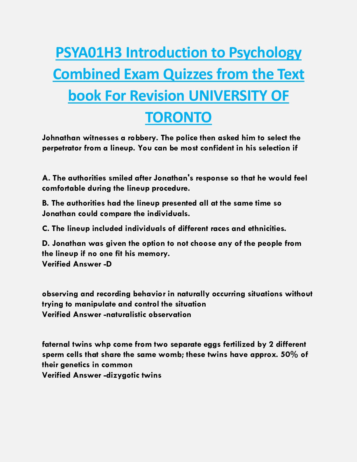 Biology > EXAM > PSYA01H3 Introduction to Psychology Combined Exam Quizzes from the Text book For Revision UNIVERSITY OF TORONTO
