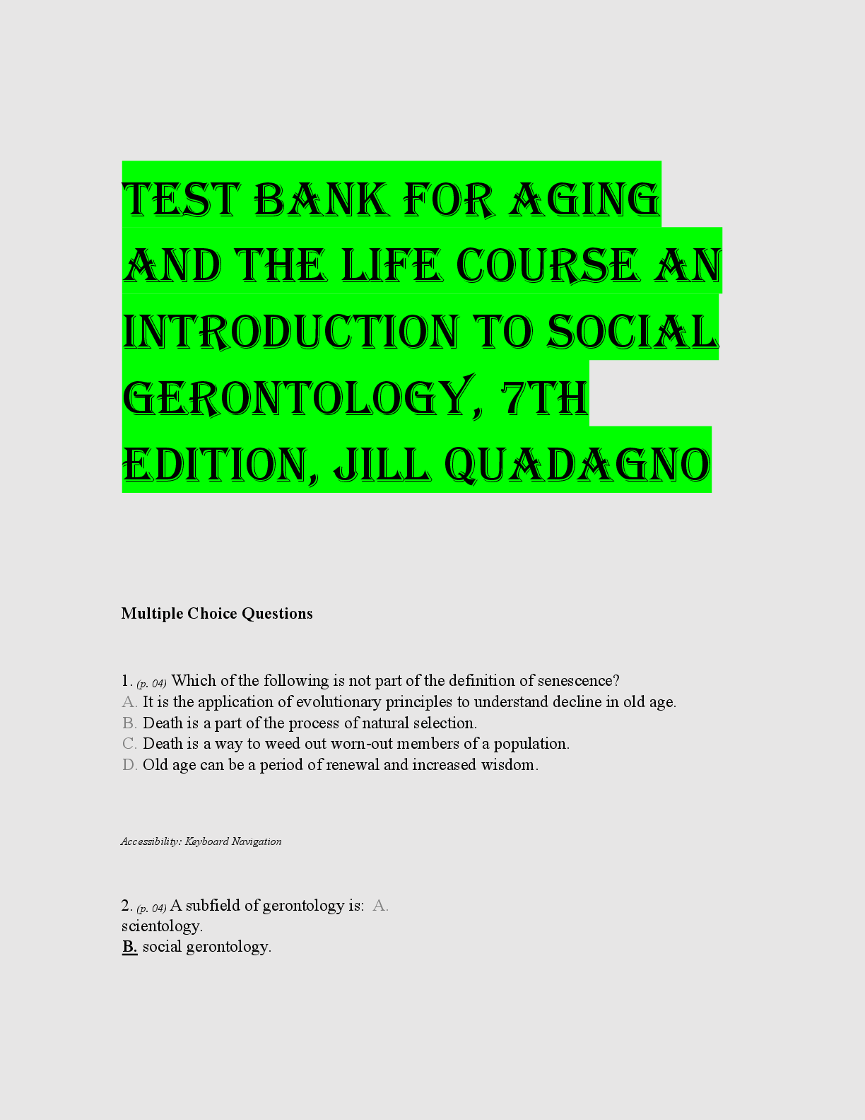 *NURSING > EXAM > TEST BANK FOR AGING AND THE LIFE COURSE AN INTRODUCTION TO SOCIAL GERONTOLOGY, 7TH EDITION, JILL QUADAGNO