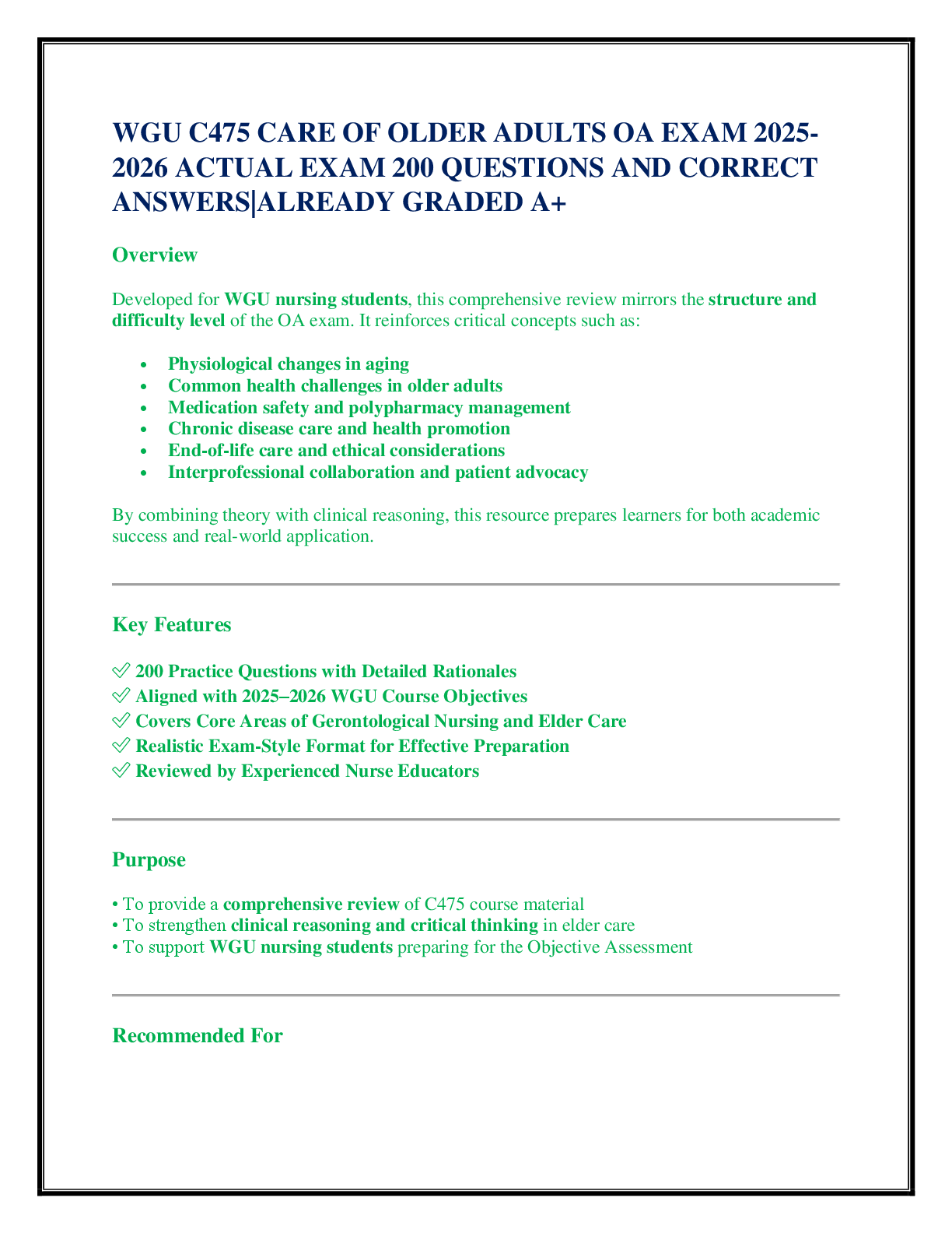 *NURSING > EXAM > WGU C475 CARE OF OLDER ADULTS OA EXAM 2025-2026 ACTUAL EXAM 200 QUESTIONS AND CORRECT ANSWERS|ALREADY GRADED A+
