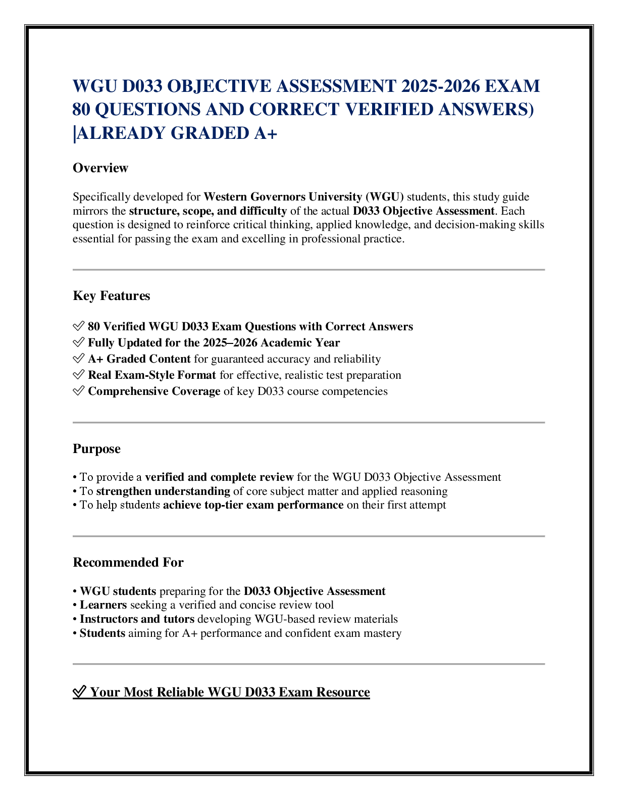 *NURSING > EXAM > WGU D033 OBJECTIVE ASSESSMENT 2025-2026 EXAM 80 QUESTIONS AND CORRECT VERIFIED ANSWERS) |ALREADY GRADED A+
