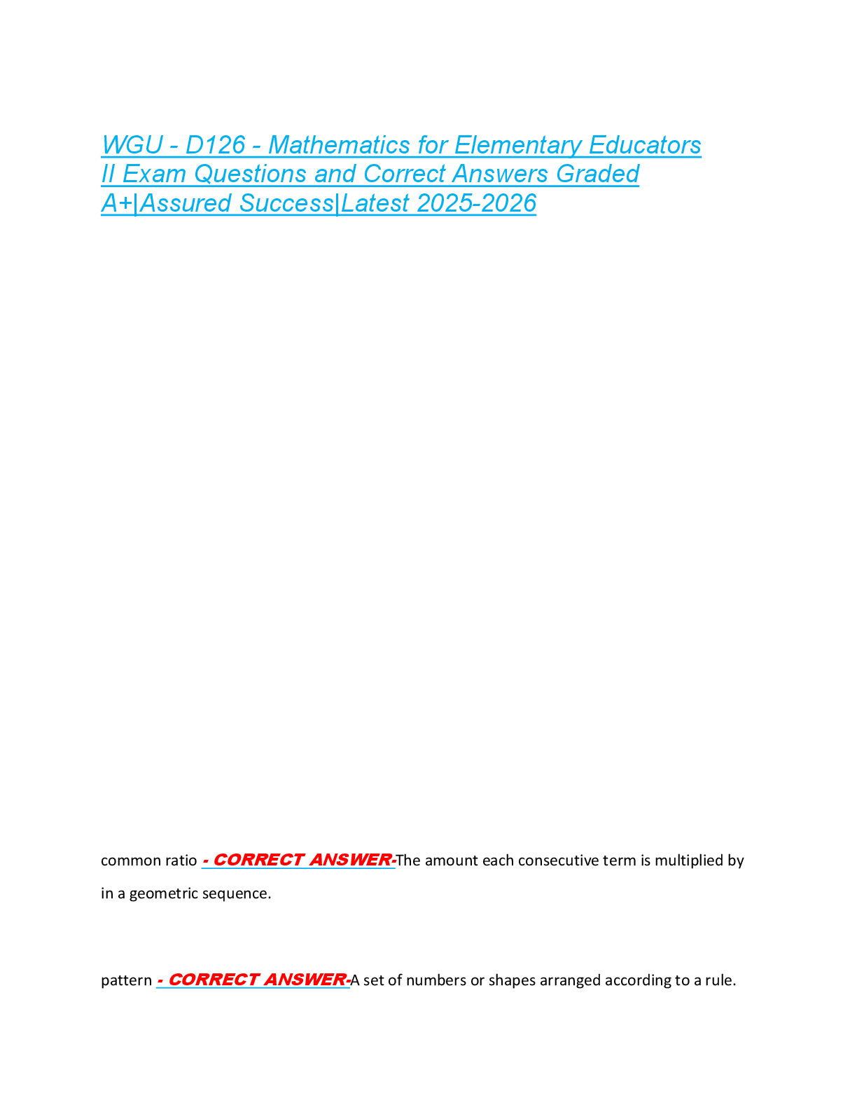 *NURSING > EXAM > WGU - D126 - Mathematics for Elementary Educators II Exam Questions and Correct Answers Graded A+|Assured Success|Latest 2025-2026