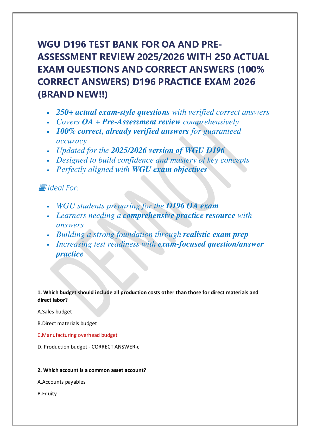 Business > EXAM > WGU D196 TEST BANK FOR OA AND PRE ASSESSMENT REVIEW 2025/2026 WITH 250 ACTUAL EXAM QUESTIONS AND CORRECT ANSWERS (100% CORRECT ANSWERS) D196 PRACTICE EXAM 2026 (BRAND NEW!!)