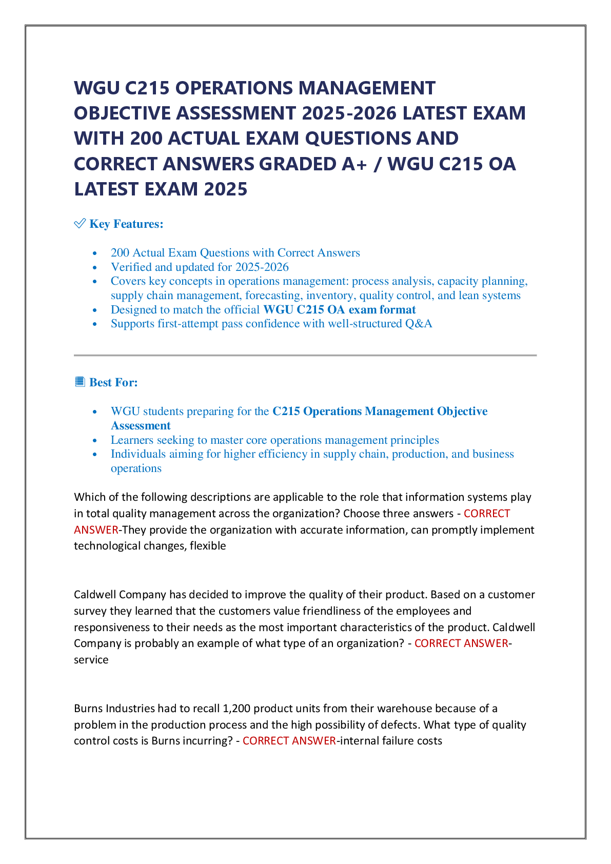 Business > EXAM > WGU C215 OPERATIONS MANAGEMENT OBJECTIVE ASSESSMENT 2025-2026 LATEST EXAM WITH 200 ACTUAL EXAM QUESTIONS AND CORRECT ANSWERS GRADED A+ / WGU C215 OA LATEST EXAM 2025