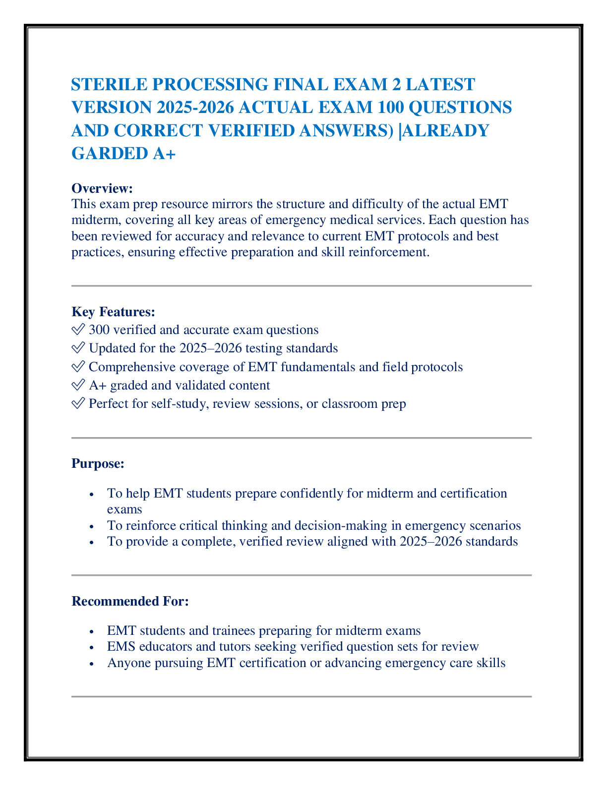 *NURSING > EXAM > STERILE PROCESSING FINAL EXAM 2 LATEST VERSION 2025-2026 ACTUAL EXAM 100 QUESTIONS AND CORRECT VERIFIED ANSWERS) |ALREADY GARDED A+