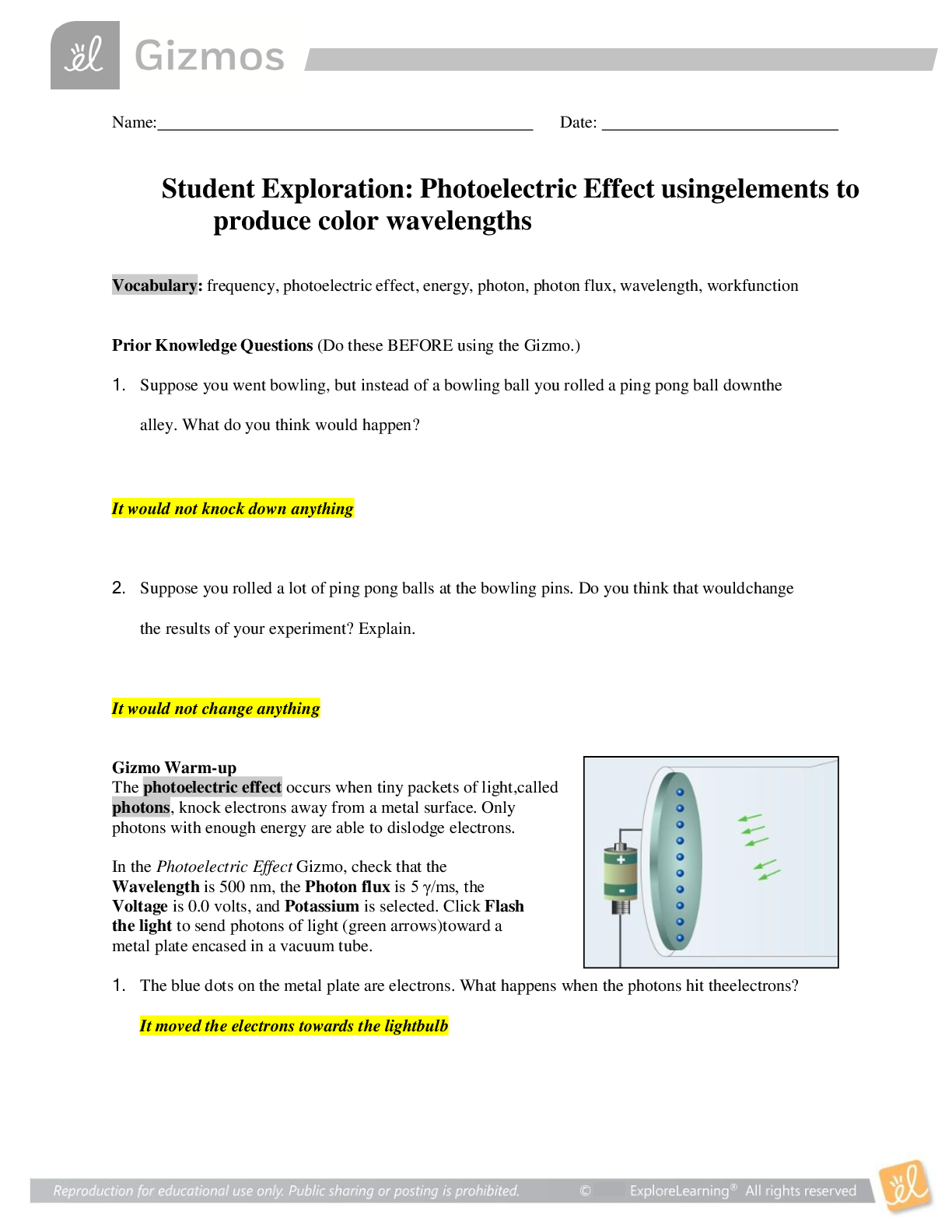 Chemistry > EXAM > Gizmos Student Exploration: Photoelectric Effect Using Elements to Produce Color Wavelengths