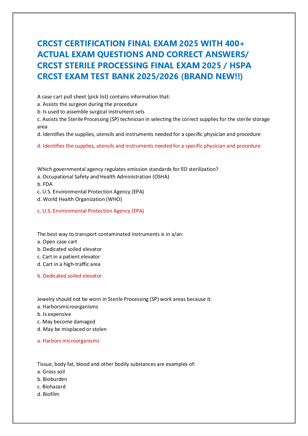 *NURSING > EXAM > CRCST CERTIFICATION FINAL EXAM 2025 WITH 400+ ACTUAL EXAM QUESTIONS AND CORRECT ANSWERS/ CRCST STERILE PROCESSING FINAL EXAM 2025 / HSPA CRCST EXAM TEST BANK 2025/2026 (BRAND NEW!!)
