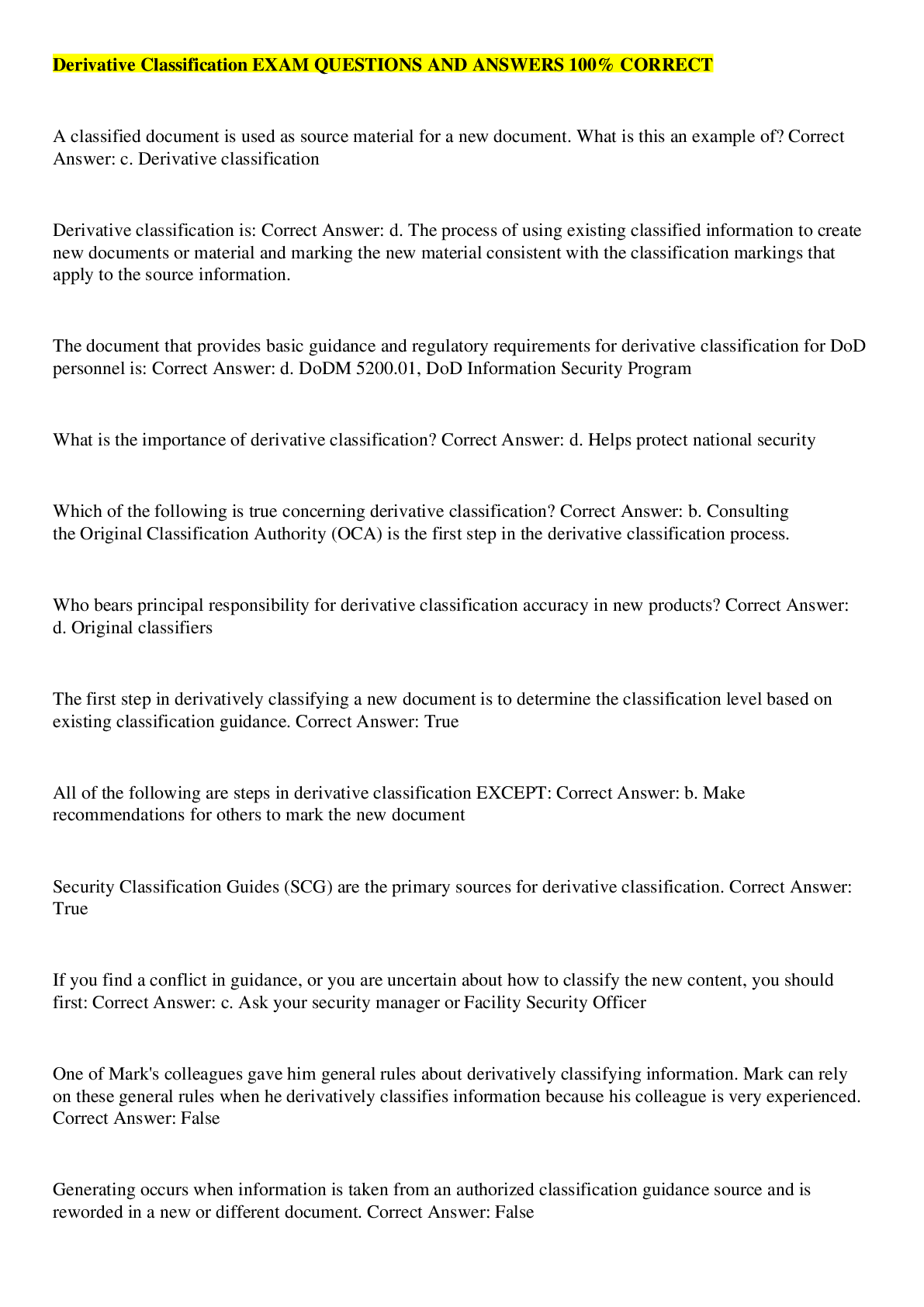 Education > EXAM > Derivative Classification EXAM QUESTIONS AND ANSWERS 100% CORRECT