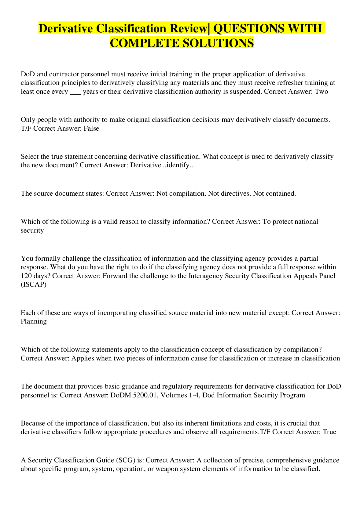 Education > EXAM > Derivative Classification Review| QUESTIONS WITH COMPLETE SOLUTIONS