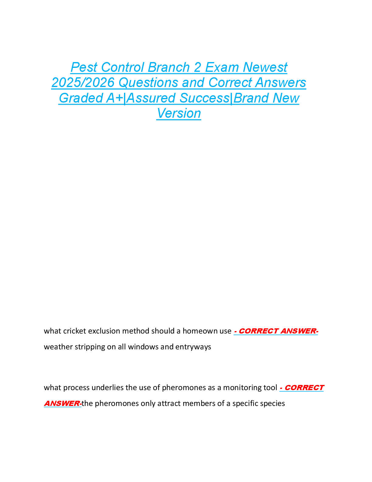 *NURSING > EXAM > Pest Control Branch 2 Exam Newest 2025/2026 Questions and Correct Answers Graded A+|Assured Success|Brand New Version