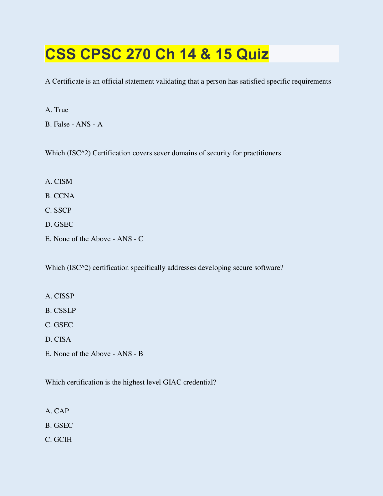 Computer Science > EXAM > CSS CPSC 270 Ch 14 & 15 Quiz | with 100% Correct Answers | Updated & Verified