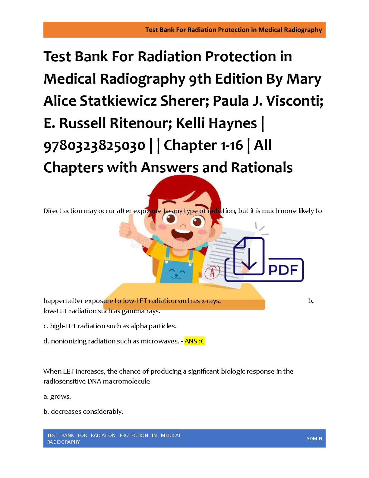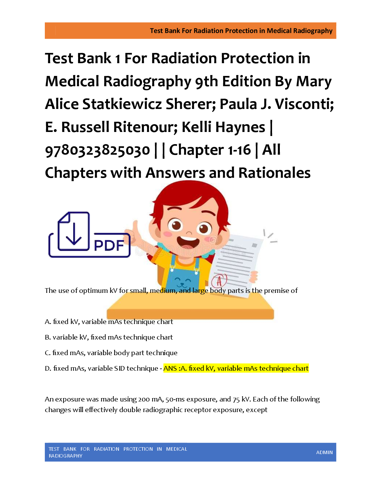 *NURSING > EXAM > Test Bank For Radiation Protection in Medical Radiography 9th Edition By Mary Alice Statkiewicz Sherer; Paula J. Visconti; E. Russell Ritenour; Kelli Haynes | 9780323825030 | | Chapter 1-16 | All Chapters with Answers and Rationals