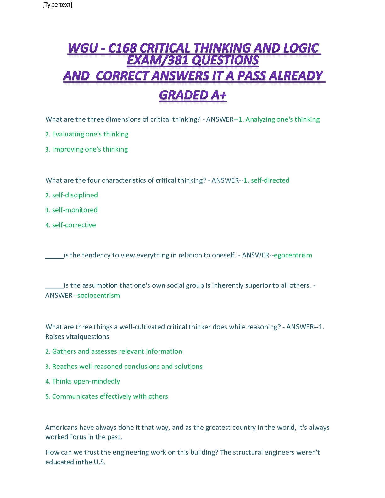 *NURSING > EXAM > WGU C168 Critical Thinking And Logic Exam 381 Questions and answers