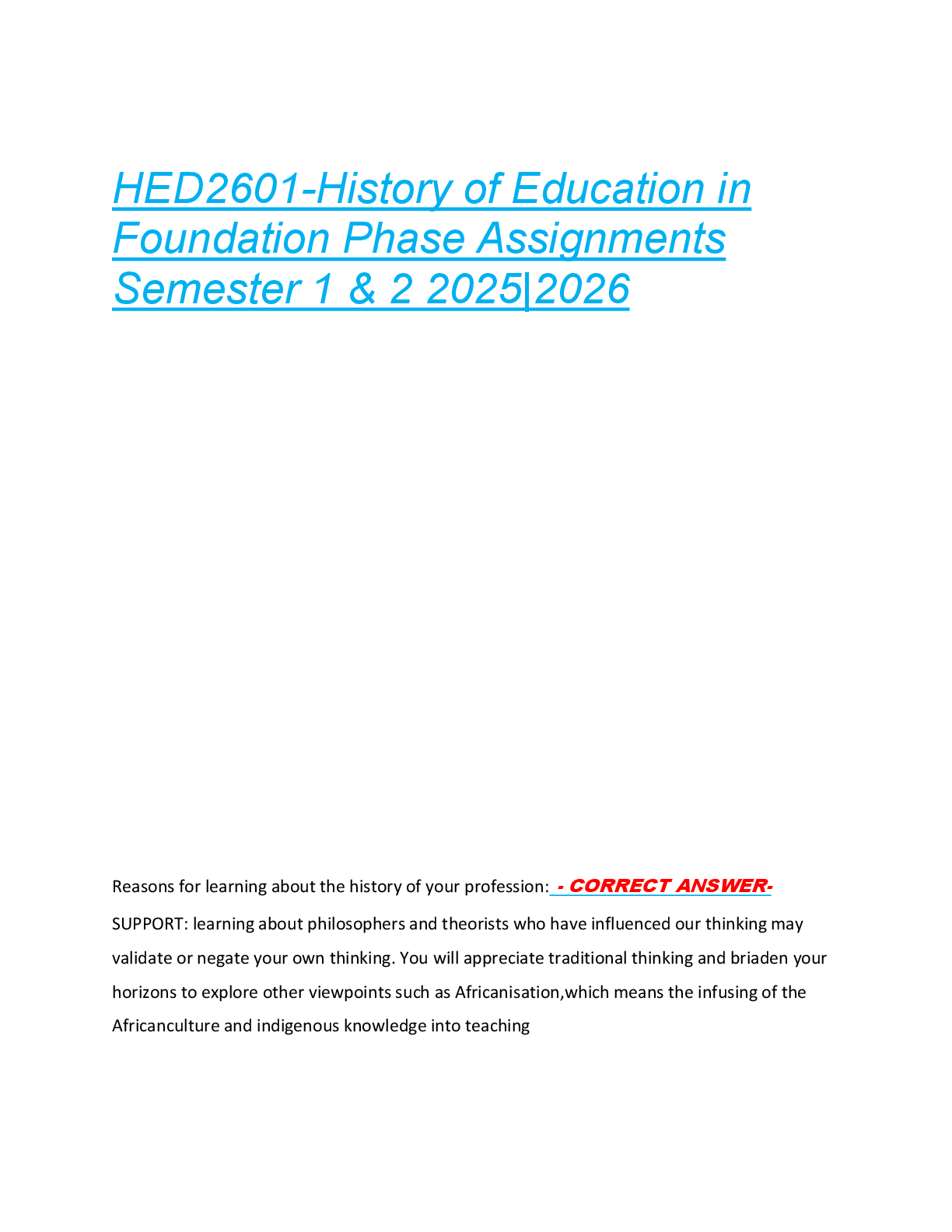 *NURSING > EXAM > HED2601-History of Education in Foundation Phase Assignments Semester 1 & 2 2025|2026