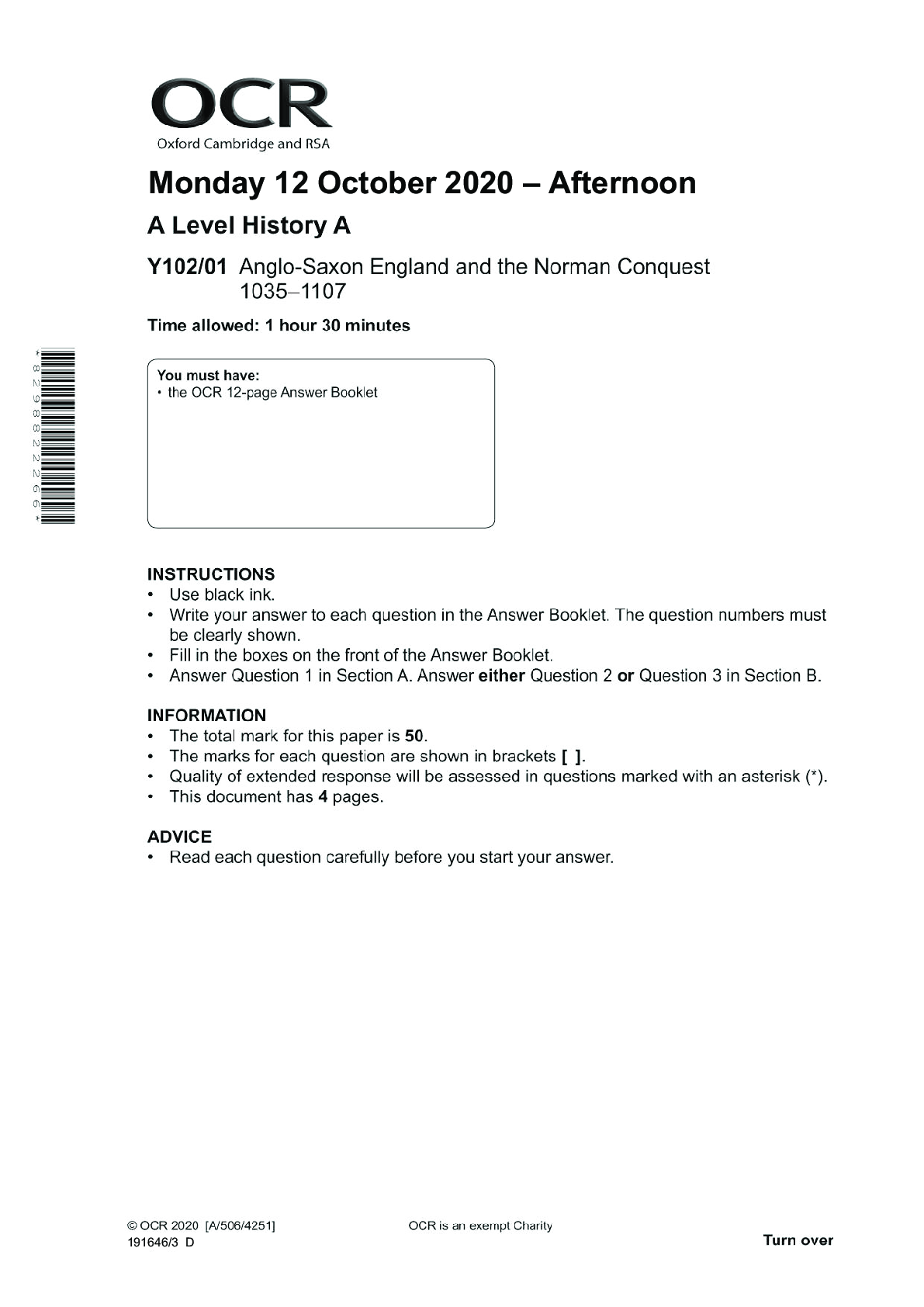History > AS Level Question Paper > History A Y102/01: Anglo-Saxon England and the Norman Conquest 1035-1107 Advanced GCE QUESTION PAPER for November 2020