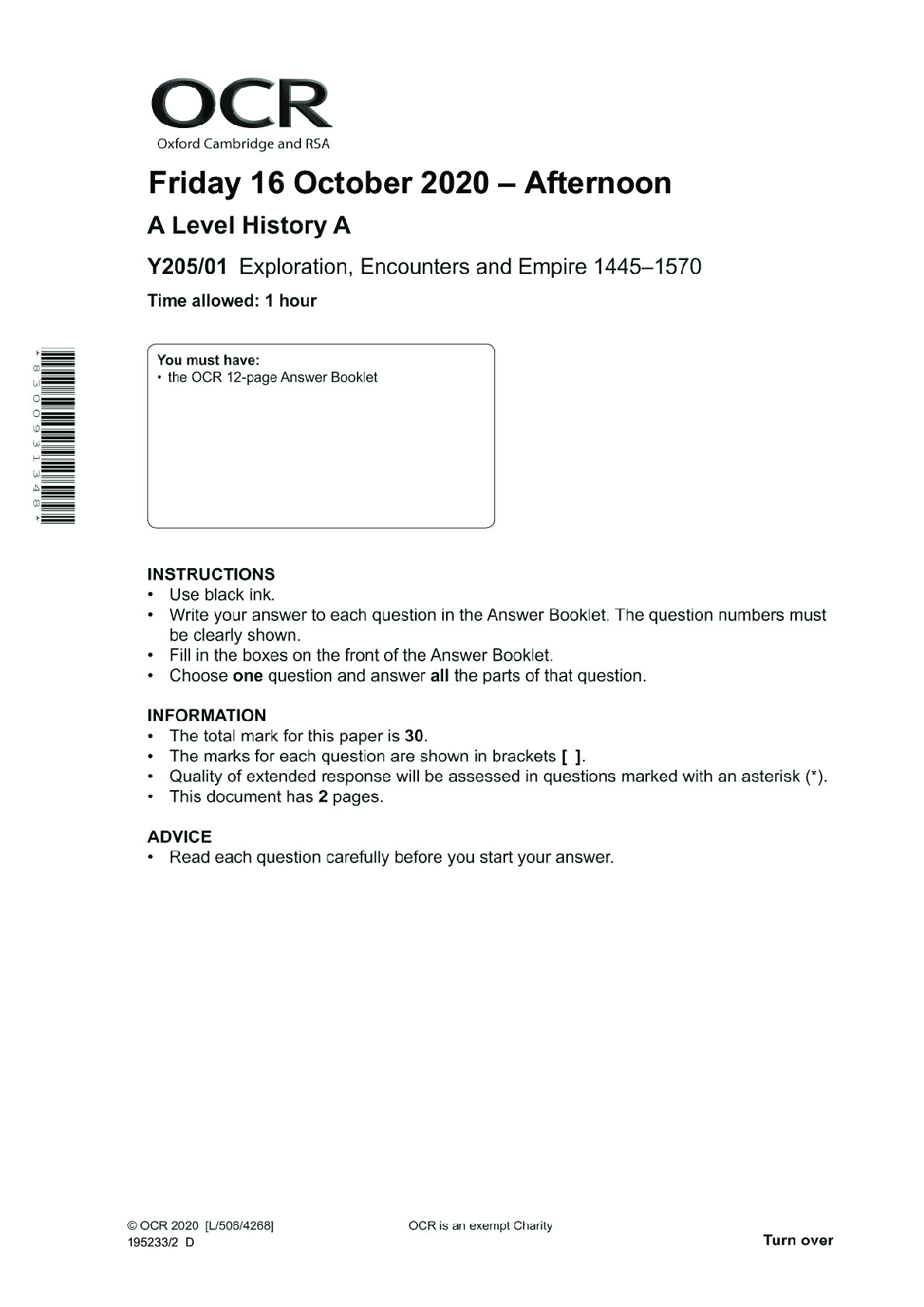 History > AS Level Question Paper > History A Y205/01: Exploration, encounters and empire 1445-1570 Advanced GCE QUESTION PAPER for November 2020