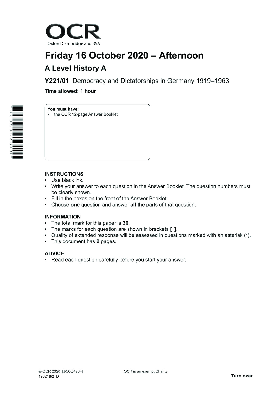 History > AS Level Question Paper > Y221/01: Democracy and dictatorships in Germany 1919-1963 Advanced GCE QUESTION PAPER for November 2020