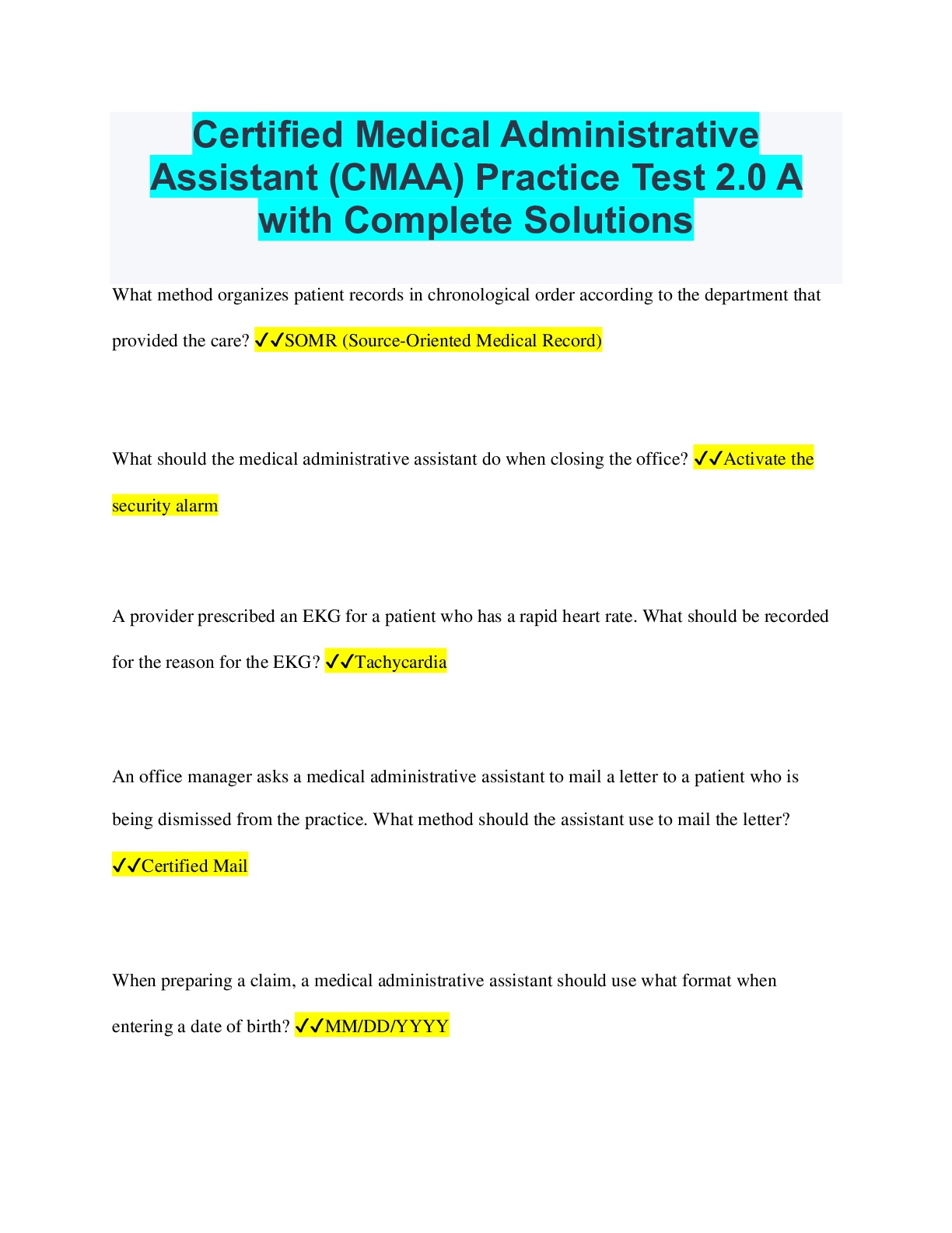 Health Care > SUMMARY > Certified Medical Administrative Assistant (CMAA) Practice Test 2.0 A with Complete Solutions