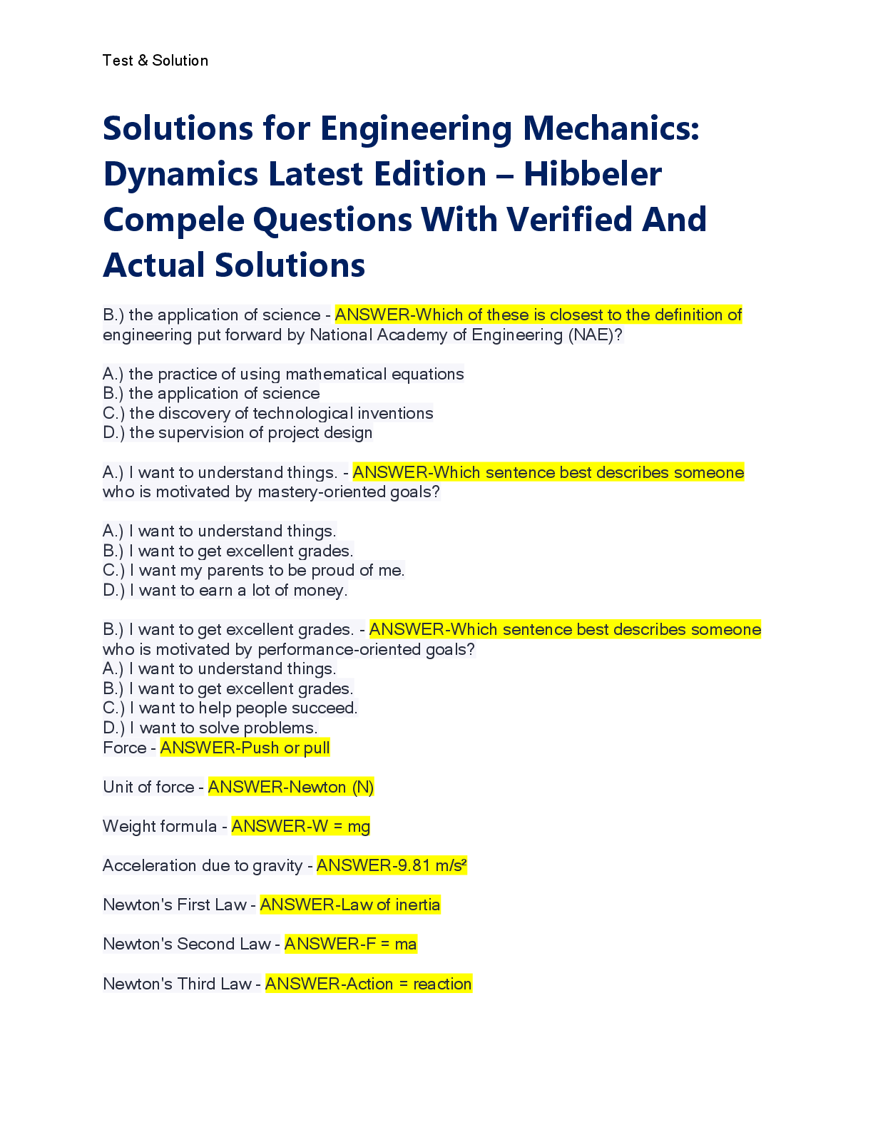 Engineering Mechanics > SOLUTIONS > Solutions for Engineering Mechanics: Dynamics Latest Edition – Hibbeler Compele Questions With Verified And Actual Solutions