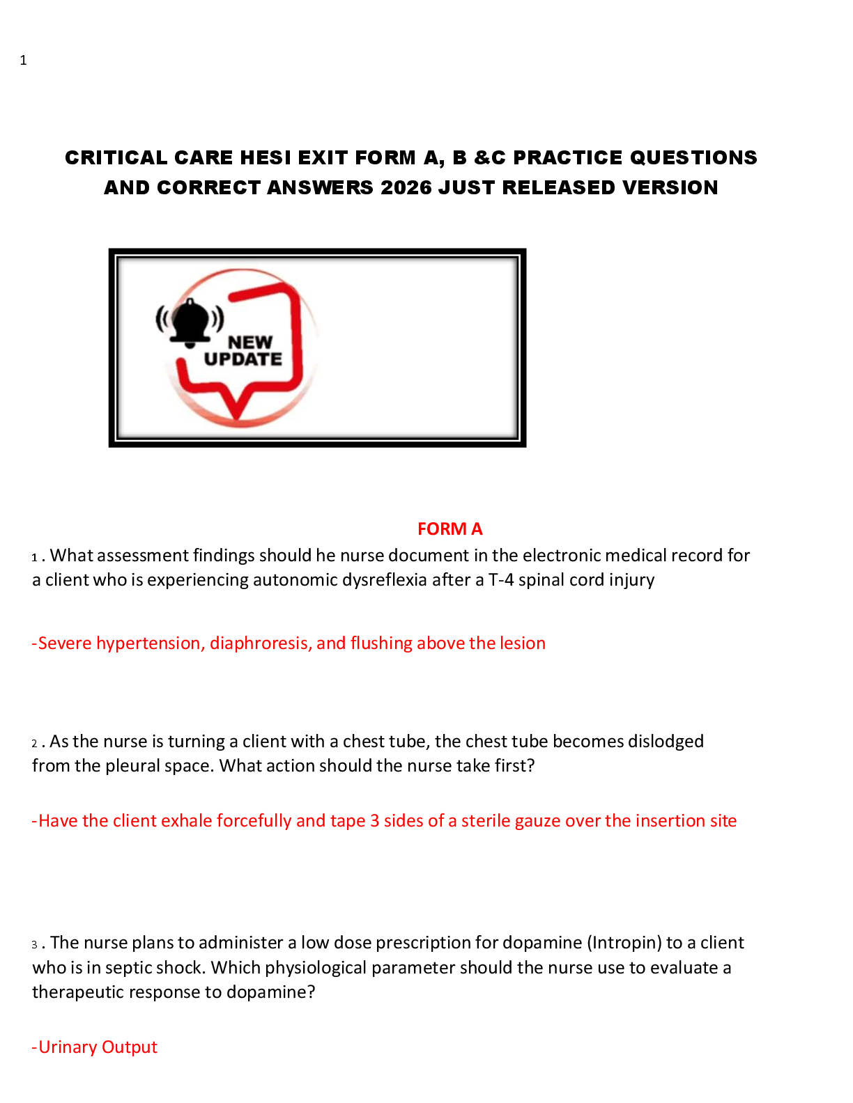 HESI > HESI A2 > CRITICAL CARE HESI EXIT FORM A, B &C PRACTICE QUESTIONS AND CORRECT ANSWERS 2026 JUST RELEASED VERSION