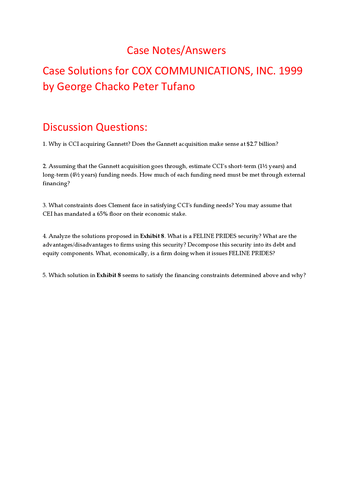 Education > HARVARD CASE SOLUTIONS > Case Solutions for COX COMMUNICATIONS, INC. 1999 by George Chacko Peter Tufano