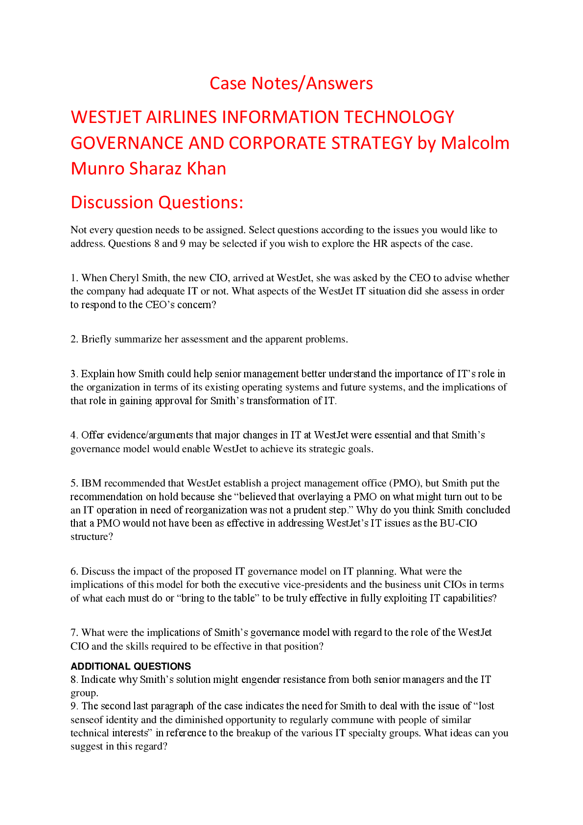 Education > HARVARD CASE SOLUTIONS > Case Notes Answers for WESTJET AIRLINES INFORMATION TECHNOLOGY GOVERNANCE AND CORPORATE STRATEGY by Malcolm Munro Sharaz Khan