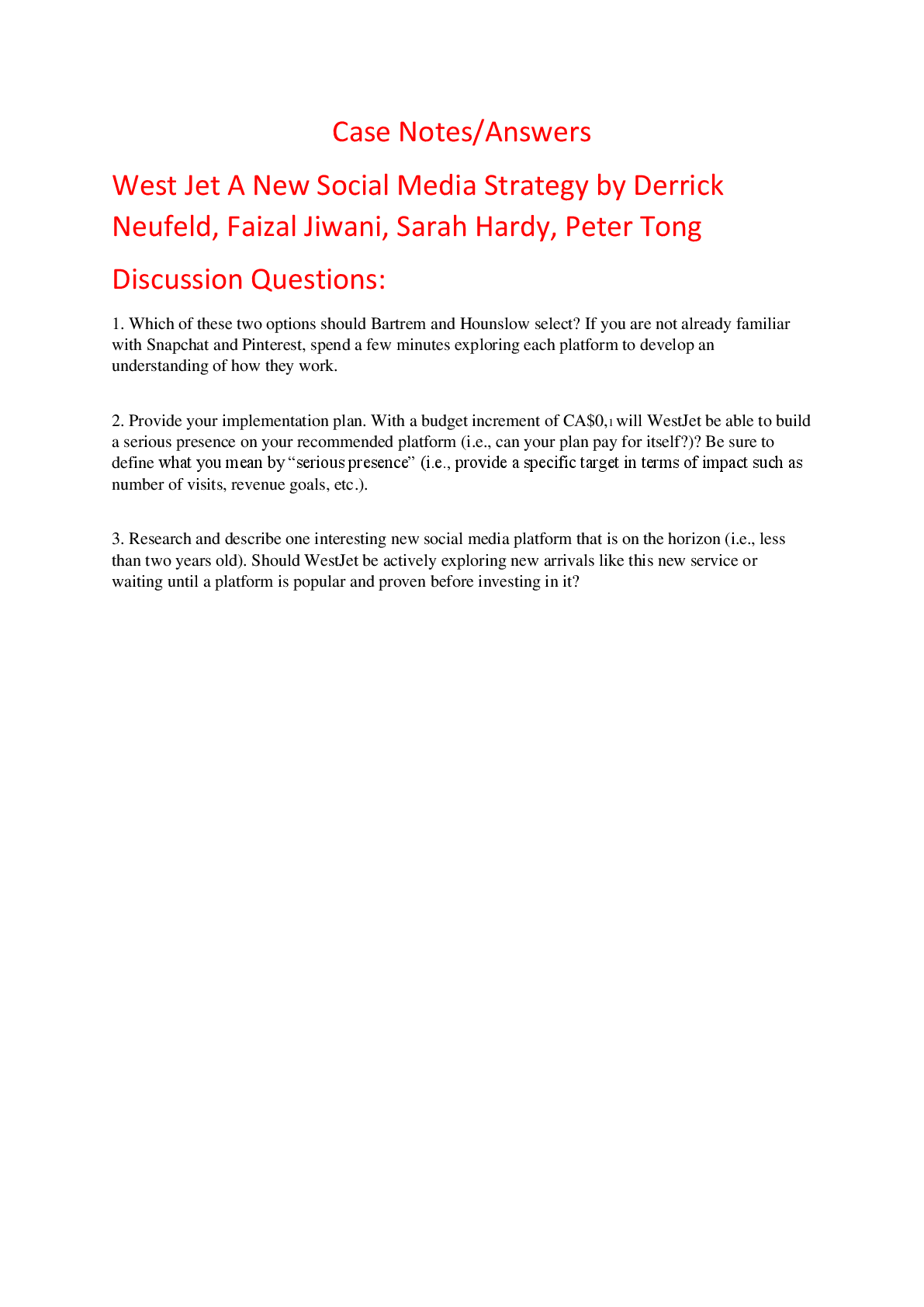 Education > HARVARD CASE SOLUTIONS > Case Notes Answers for WestJet A New Social Media Strategy by Derrick Neufeld, Faizal Jiwani, Sarah Hardy, Peter Tong