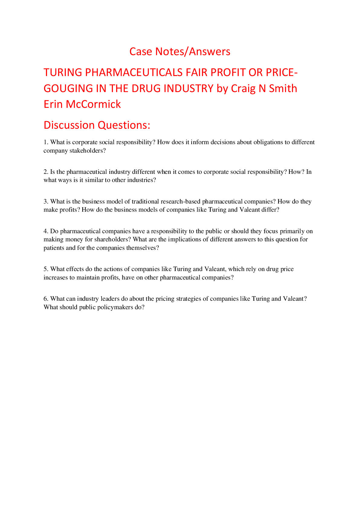 Education > HARVARD CASE SOLUTIONS > Case Notes Answers for TURING PHARMACEUTICALS FAIR PROFIT OR PRICE-GOUGING IN THE DRUG INDUSTRY by Craig N Smith Erin McCormick