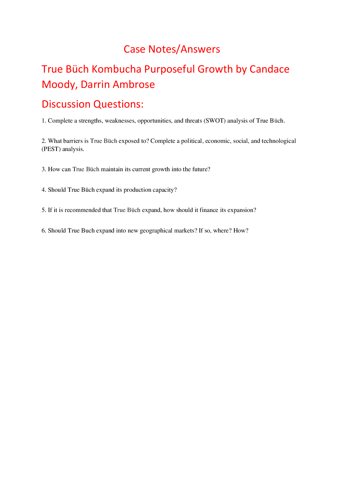 Education > HARVARD CASE SOLUTIONS > Case Notes Answers for True Büch Kombucha Purposeful Growth by Candace Moody, Darrin Ambrose