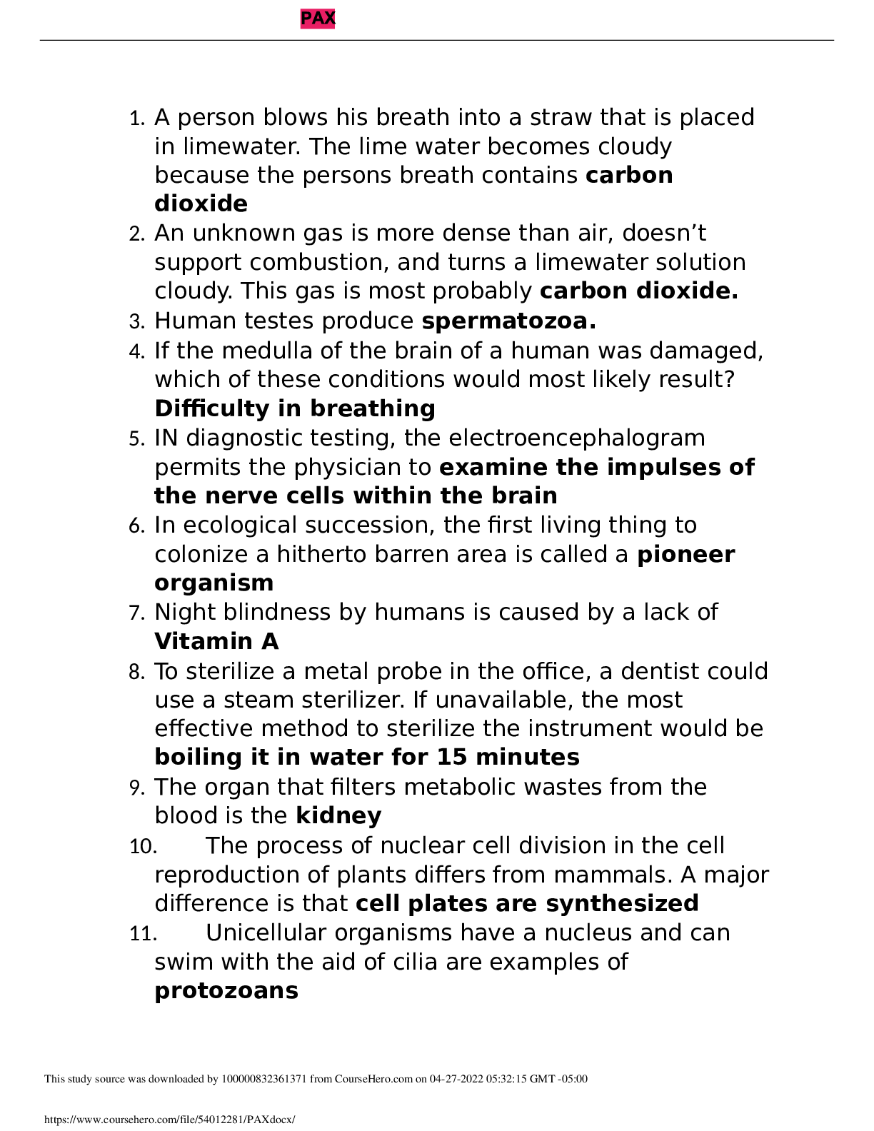 Biology > STUDY GUIDE > PAX Science QUESTIONS AND ANSWERS REVIEW 2021/2022