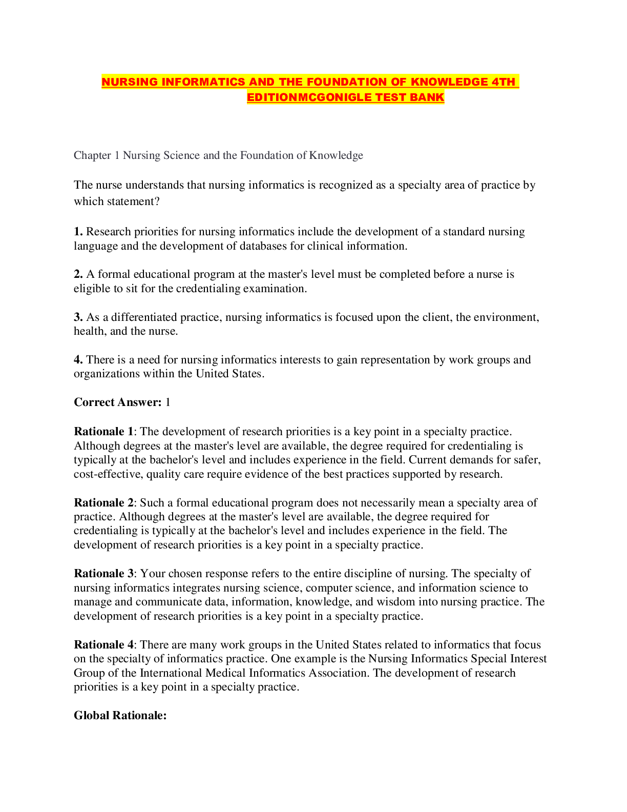 *NURSING > STUDY GUIDE > NURSING INFORMATICS AND THE FOUNDATION OF KNOWLEDGE 4TH EDITION MCGONIGLE TEST BANK | WITH RATONALES*