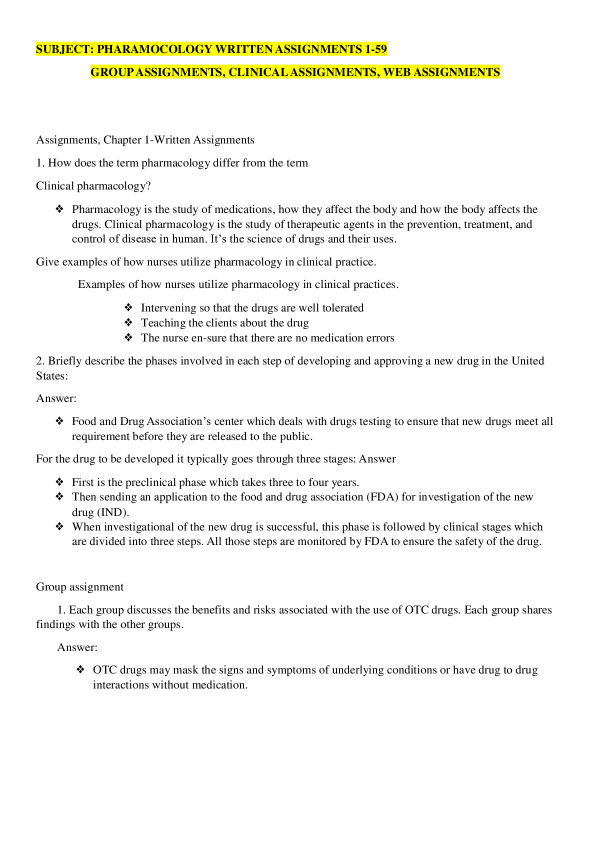 *NURSING > STUDY GUIDE > PHARMACOLOGY WRITTEN ASSIGNMENTS 1-59 GROUP ASSIGNMENTS, CLINICAL ASSIGNMENTS, WEB ASSIGNMENTS