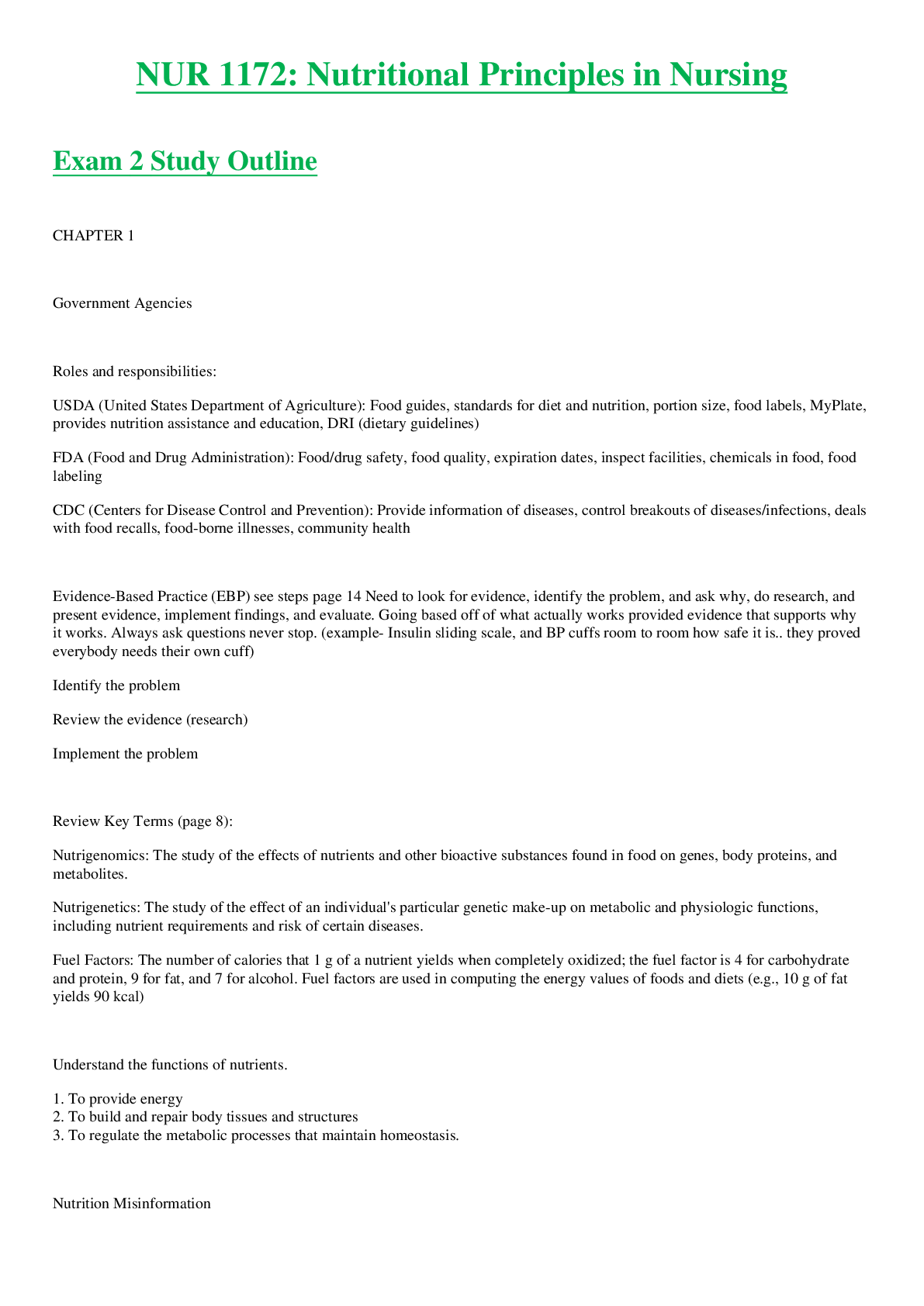 *NURSING > STUDY GUIDE > NUR 1172 / NUR1172: Nutritional Principles in Nursing Exam 2 Study Outline Latest Update Rasmussen