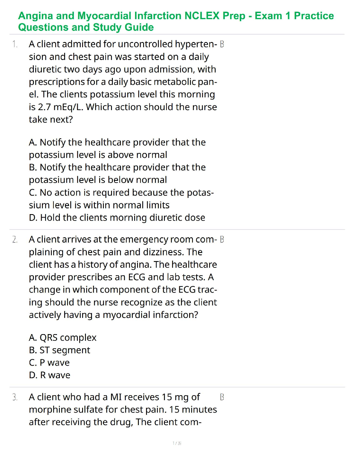 *NURSING > STUDY GUIDE > Angina and Myocardial Infarction NCLEX Prep - Exam 1 Practice Questions and Study Guide
