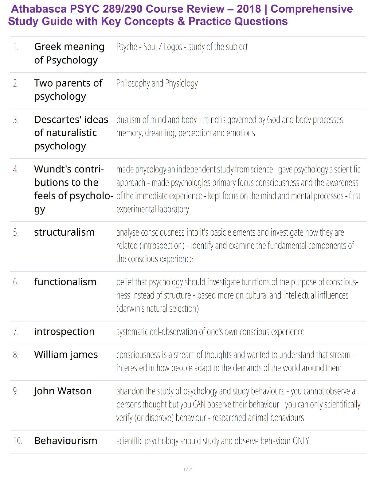Psychology > STUDY GUIDE > Athabasca PSYC 289/290 Course Review – 2018 | Comprehensive Study Guide with Key Concepts & Practice Questions