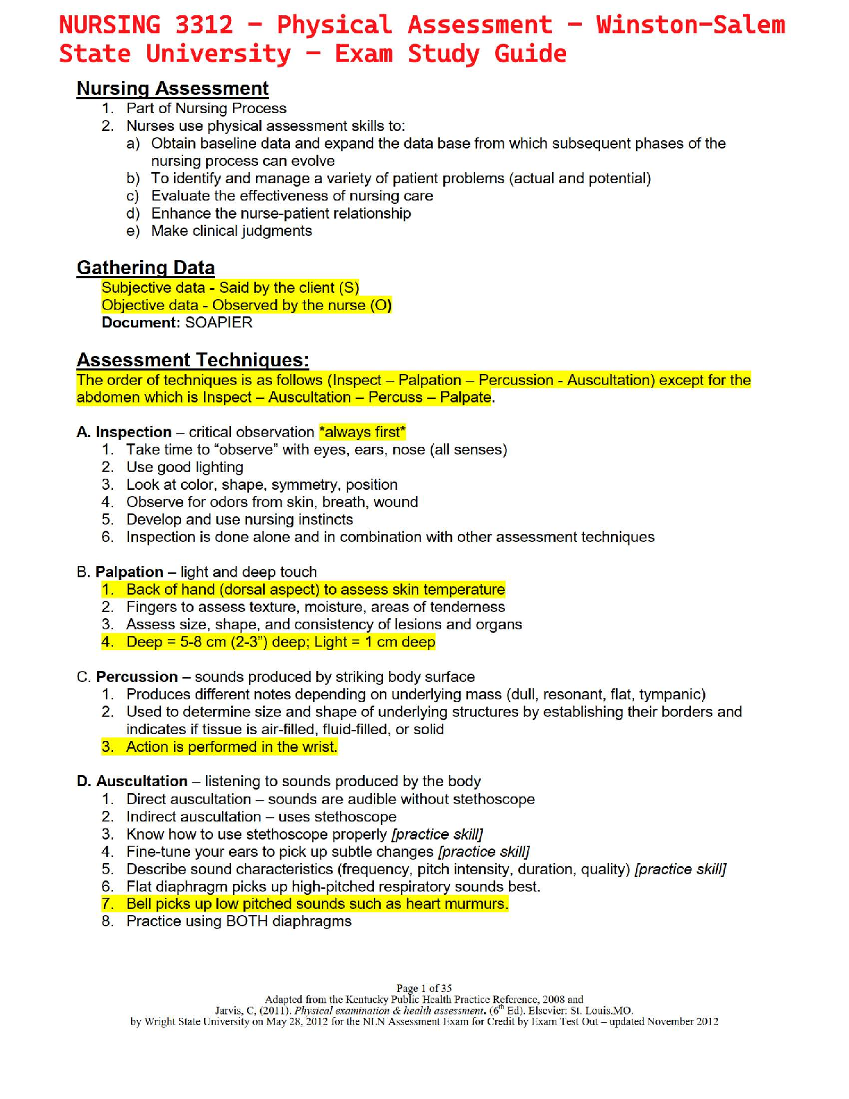 *NURSING > STUDY GUIDE > NURSING 3312 – Physical Assessment – Winston-Salem State University – Exam Study Guide