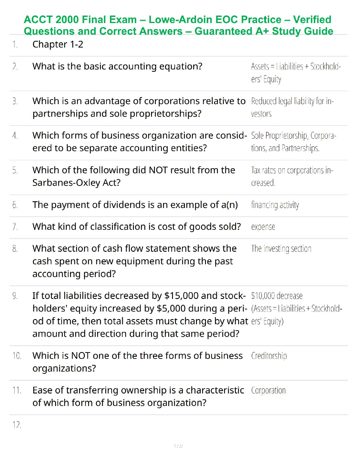 Accounting > STUDY GUIDE > ACCT 2000 Final Exam – Lowe-Ardoin EOC Practice – Verified Questions and Correct Answers – Guaranteed A+ Study Guide