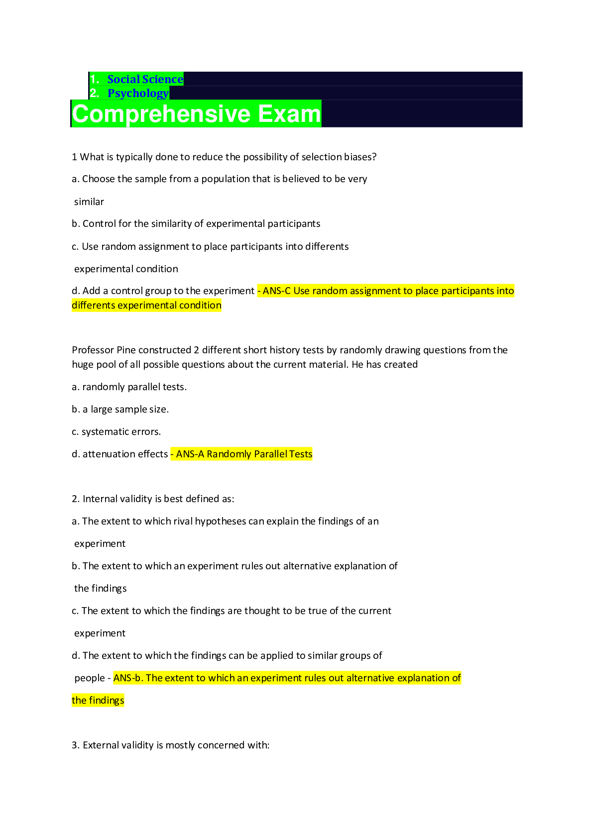 Psychology > STUDY GUIDE > Social Science : Psychology Comprehensive Exam Questions with Correct Answers