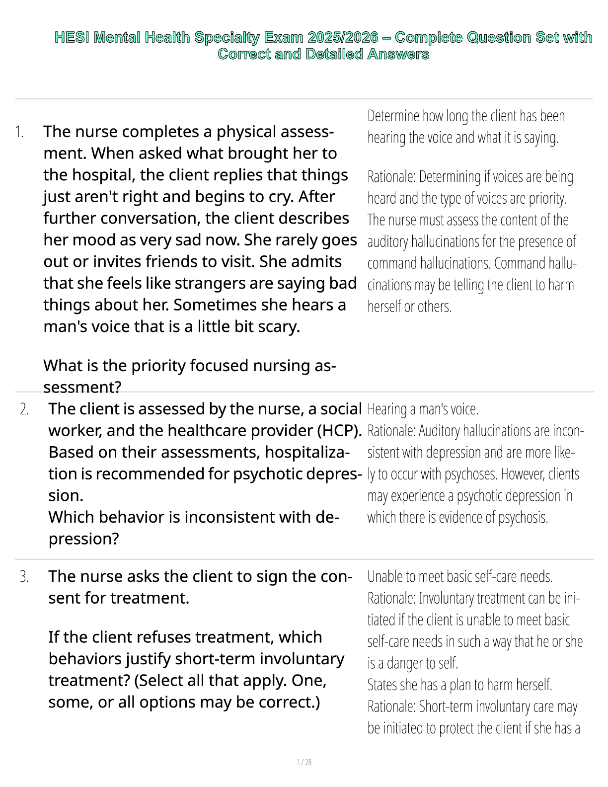 *NURSING > STUDY GUIDE > HESI Mental Health Specialty Exam 2025/2026 – Complete Question Set with Correct and Detailed Answers