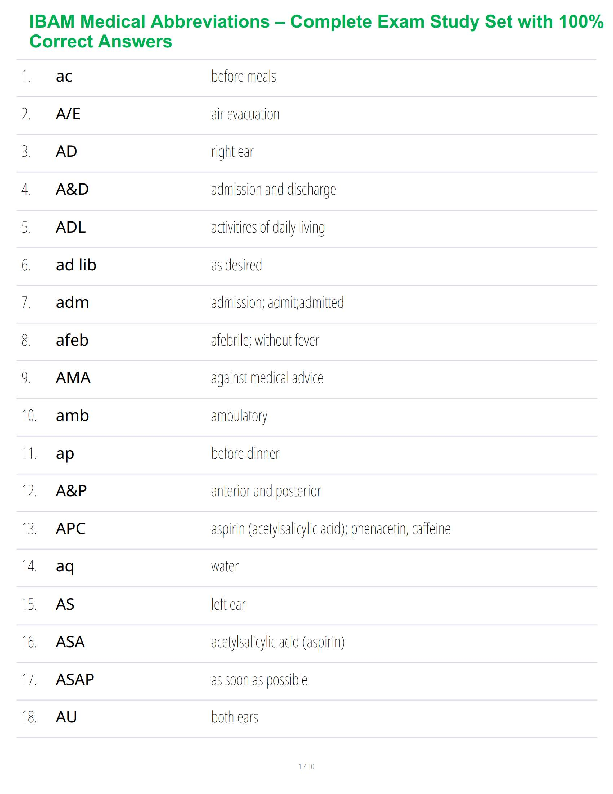 Health Care > STUDY GUIDE > IBAM Medical Abbreviations – Complete Exam Study Set with 100% Correct Answers