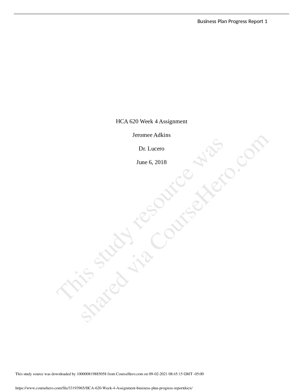 Business > BUSINESS PLAN > HCA 620 Week 4 Assignment business plan progress report