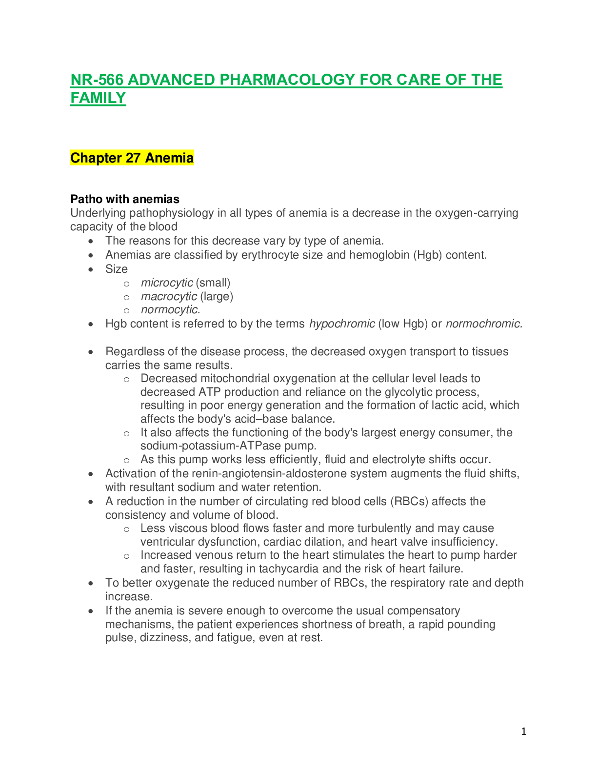 *NURSING > Summary > NR566 / NR 566: Advanced Pharmacology for Care of the Family Week 5 Chapter 27 Notes - Anemia Latest Update Chamberlain College Of Nursing