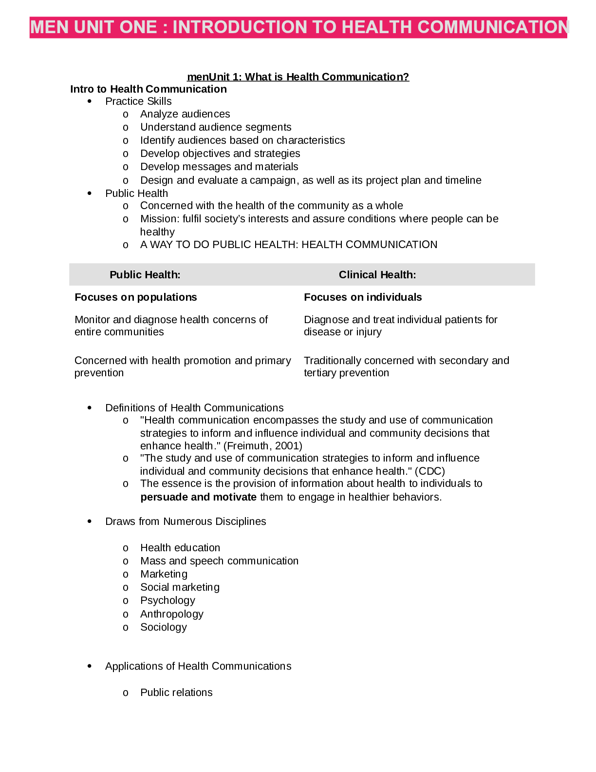 Psychology > Summary > MEN UNIT ONE : INTRODUCTION TO HEALTH COMMUNICATION
