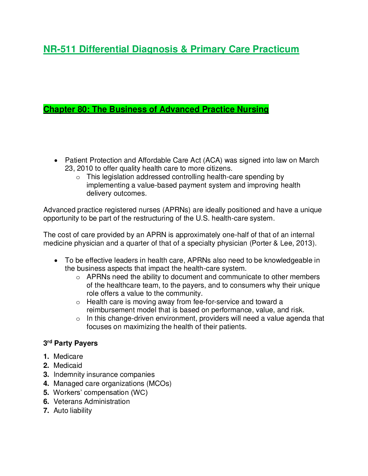 *NURSING > Summary > NR511 / NR 511: Differential Diagnosis & Primary Care Practicum Week 1 Chapter 80 Notes - The Business of Advanced Practice Nursing (2021 / 2022) Chamberlain College Of Nursing